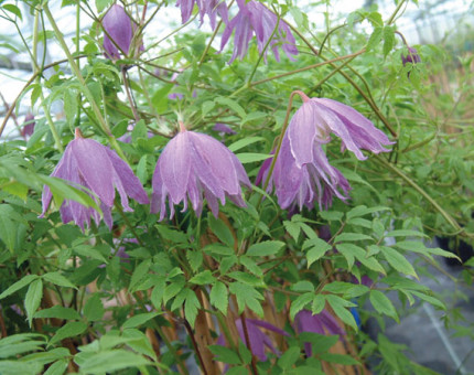 Purple-mauve lantern like flowers open in spring on climbing stems of this deciduous climber. the flowers then become decorative seed heads. a second flush of flowers can appear during mid to late summer.