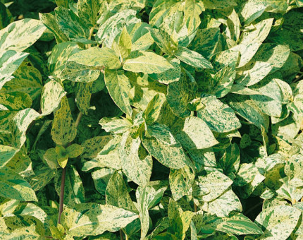 Evergreen climbing honeysuckle with mottled green and white leaves turning pink in colder weather. small white flowers produced throughout summer turning yellow in autumn.